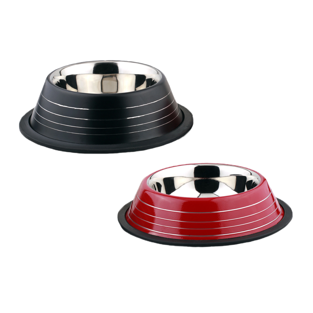 Bol din inox pentru hrană animale, diametru 19 cm, cu suport gumat antiderapant. Disponibil în culorile roșu și negru, ideal pentru câini medii și mari sau pisici. Durabil, stabil și ușor de curățat.