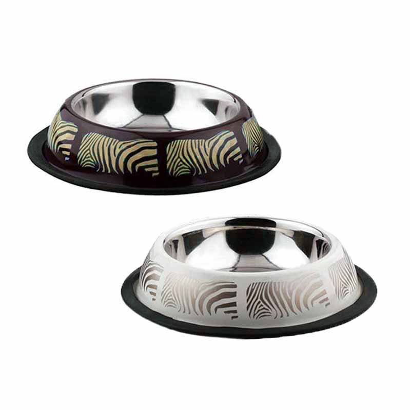 Bol din inox pentru hrană animale, diametru 15,5 cm, cu suport gumat antiderapant. Model zebră, disponibil în culorile alb și maro. Ideal pentru câini mici și medii sau pisici. Durabil, stabil și ușor de curățat.