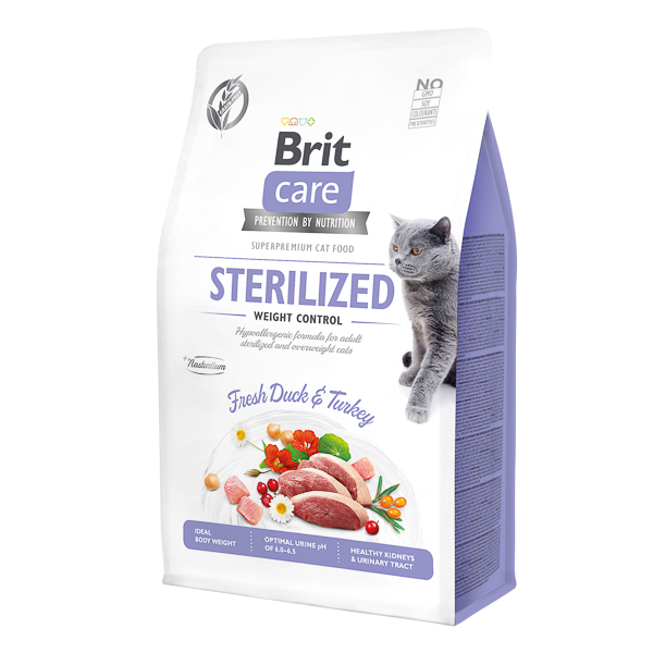 Hrana uscat? Brit Care?Cat Grain-Free Sterilized Weight Control, cu ra?? ?i?curcan, 400 g, este o formul? superpremium f?r??cereale, conceput? pentru pisicile sterilizate sau?supraponderale. Bogat? ?n fibre ?i?proteine, cu?un con?inut redus de gr?simi, sus?ine men?inerea greut??ii ideale ?i?s?n?tatea tractului urinar.