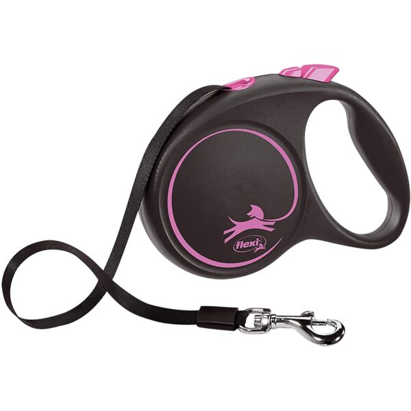 Lesa Flexi Black Design retractabilă, bandă, mărimea L, lungime 5 metri, pentru câini până la 50 kg, culoare roz. Oferă libertate de mișcare, control complet, design ergonomic și durabilitate. Ideală pentru plimbări sigure.