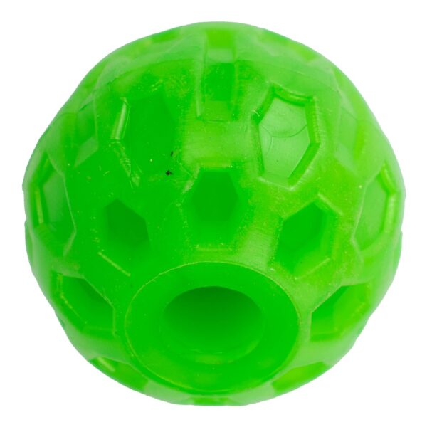 Jucărie din cauciuc eco pentru câini, formă de minge cu gaură, 4 cm, verde. Durabilă și sigură, stimulează activitatea fizică și mentală. Ideală pentru joacă și aport, non-toxică și prietenoasă cu mediul.