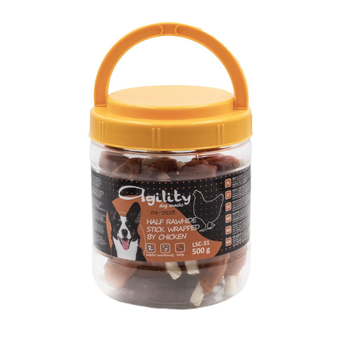 Recompense pentru câini Agility, bețe din piele crudă înfășurate cu pui, 500g. Delicii savuroase și hrănitoare, ideale pentru câini de toate taliile și vârstele. Fără aditivi artificiali.